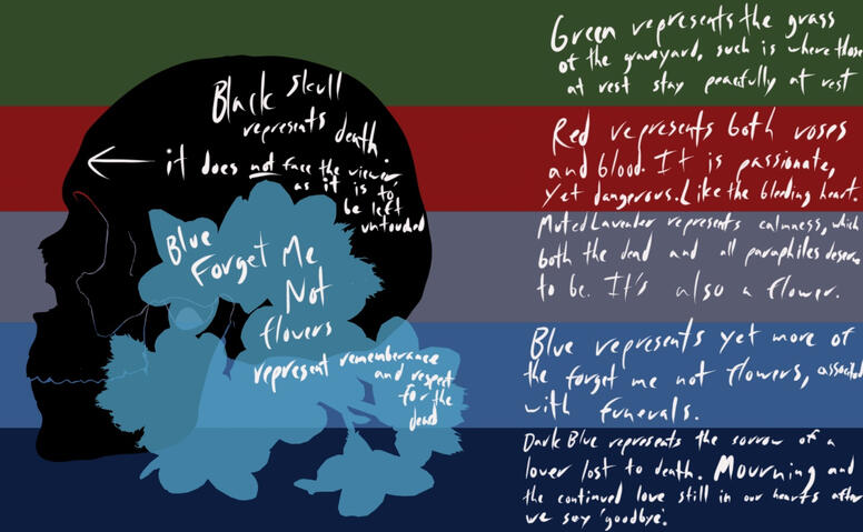 Glad you asked. Credit where credit is due, the FMN flag is based on the design by tumblr user necrophiliacofthe day, which can be found backed up on their page right hereThe color meanings on their flag cite things such as “the biblical color of pestilence” and “it reminds me of rotting flesh”, which holds very little meaning for me.Instead, my flag holds the following meanings:Black skull represents death. It does not face the viewer, as it is to be left untouched.Blue forget-me-not flowers represent remembrance and respect for the dead.Green represents the grass of the graveyard, such is where those at rest stay peacefully at rest.Red represents both roses and blood. It is passionate yet dangerous, like the bleeding heart.Muted Lavender represents calmness, which both the dead and all paraphiles deserve to be. It’s also a flower.Blue represents yet more of the forget-me-not flowers, associated with funerals.Dark Blue represents the sorrow of a lover lost to death. Mourning and the continued love still in our hearts after we say ‘goodbye’.